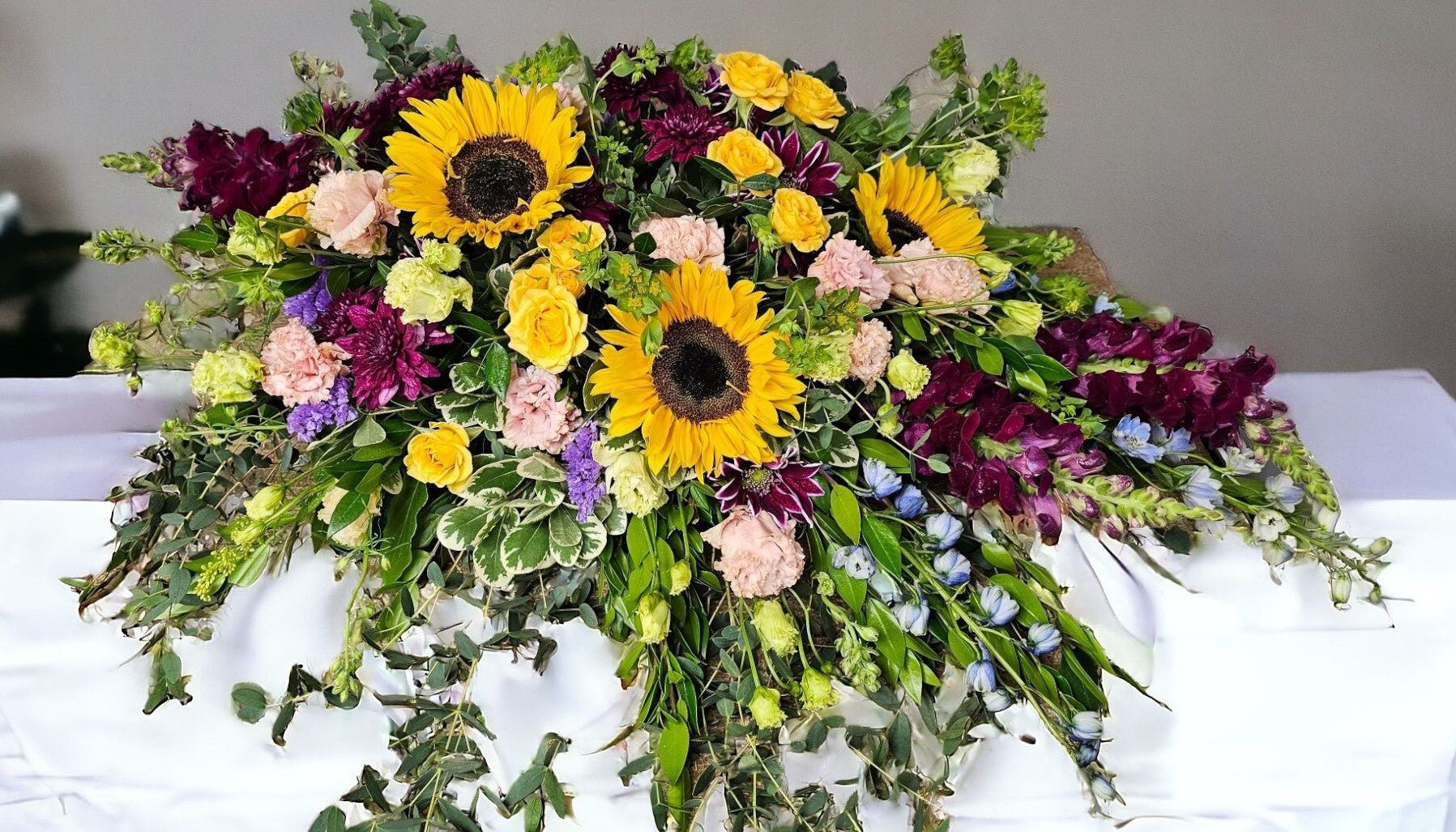 Go to the shopCasket saddle with sunflowers and other complimentary flowers. Half casket shown.