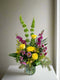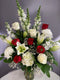Red, yellow and pink roses are mixed with yellow and green filler flowers and greens in a white cube. Standard is 9 roses, Deluxe is 12 roses, Premium is 15 roses. Some filler flowers may vary depending on seasonal availability. Style, colour, shape and value will be maintained.